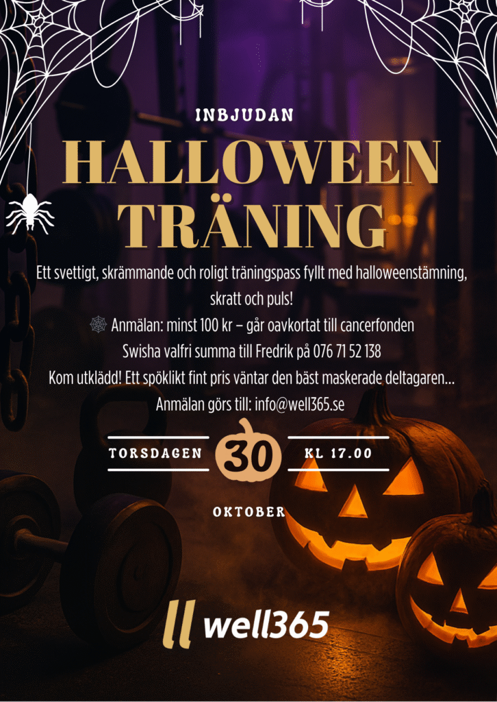 Varmt välkommen att fira Halloween tillsammans med oss på MyTraining tisdag 31/10! Vi bjuder på ett skrämmande bra träningspass och enklare fika samt möjlighet att genomföra en kroppsmätning för att få reda på din muskelmassa, fettprocent och metaboliska ålder! Endast 15 platser finns så skynda med din anmälan till info@well365.se eller via telefon 0767152138 OBS. […]